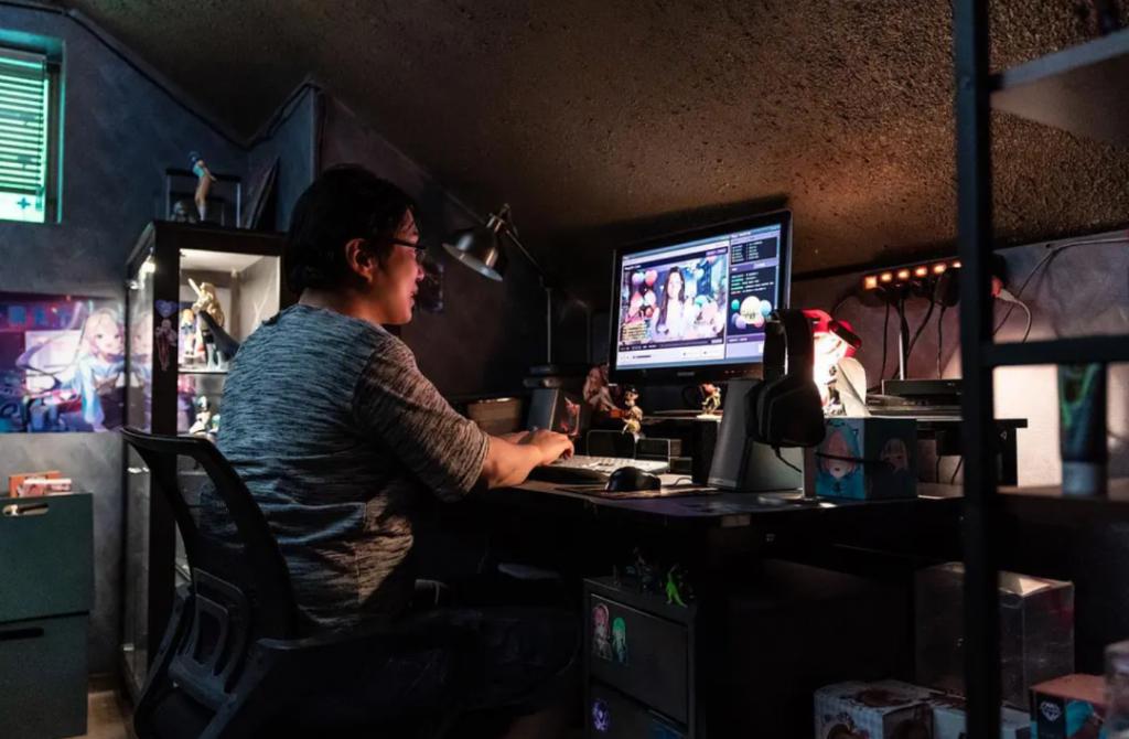 而到了夜里,他是陪充气娃娃玩情色过家家、对着性感美女直播间打手枪的肥宅猥琐男。