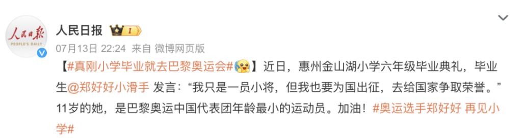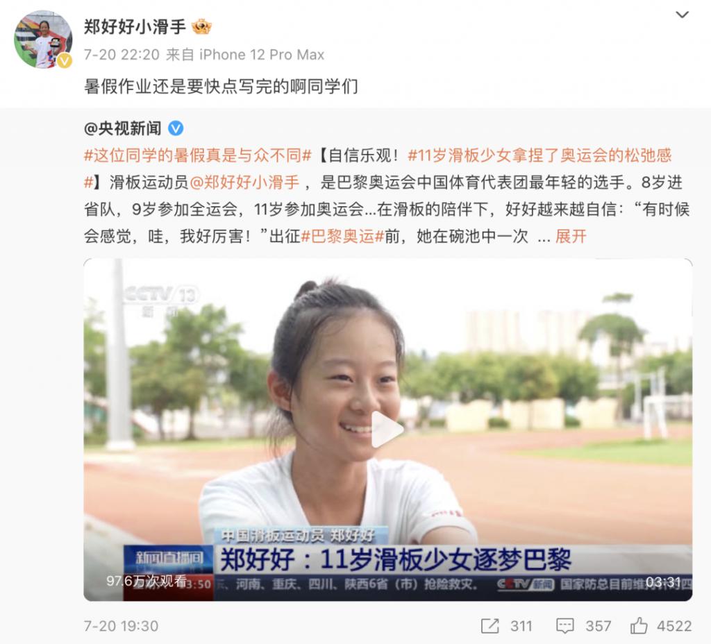 年龄最小的是滑板运动员「郑好好」,今年只有 11 岁,小学才刚毕业,出征奥运会的前几天她还在学校里参加毕业典礼。