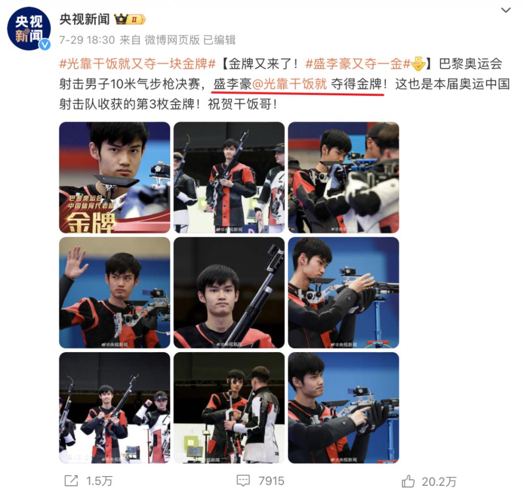 于是当官媒祝贺盛李豪夺冠的时候,画风就成了这个样子:盛李豪光靠干饭就夺得金牌。
