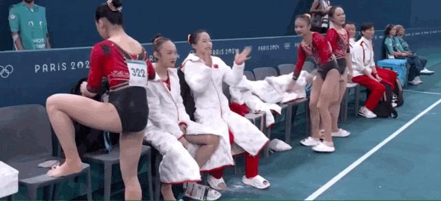 队友喊她穿衣服,而她为了跟偶像拜尔斯合照,死活不愿意,急得猛猛跺脚。