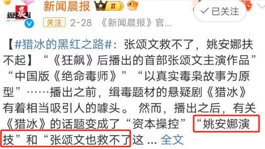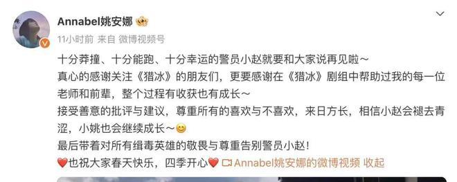 昨天 3 月 1 日是《猎冰》大结局点映,姚安娜第一次就所有的争议作出了公开回应。她说:" 接受善意的批评与建议,尊重所有的喜欢与喜欢,来日方长,相信小赵会褪去青涩,小姚也会继续成长 "。