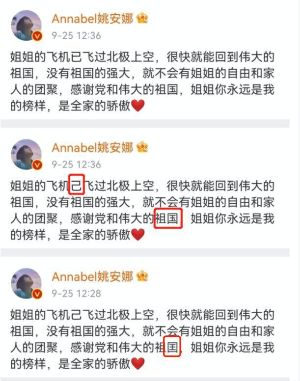 姐姐荣誉归国时,姚安娜发文庆祝,但是文案中的常用字中都有好几个错别字,她连续改了三遍才都改正确,这跟哈佛毕业的智商背书也是很违和,姚安娜只能以 " 激动的心、颤抖的手 " 来结束尴尬。