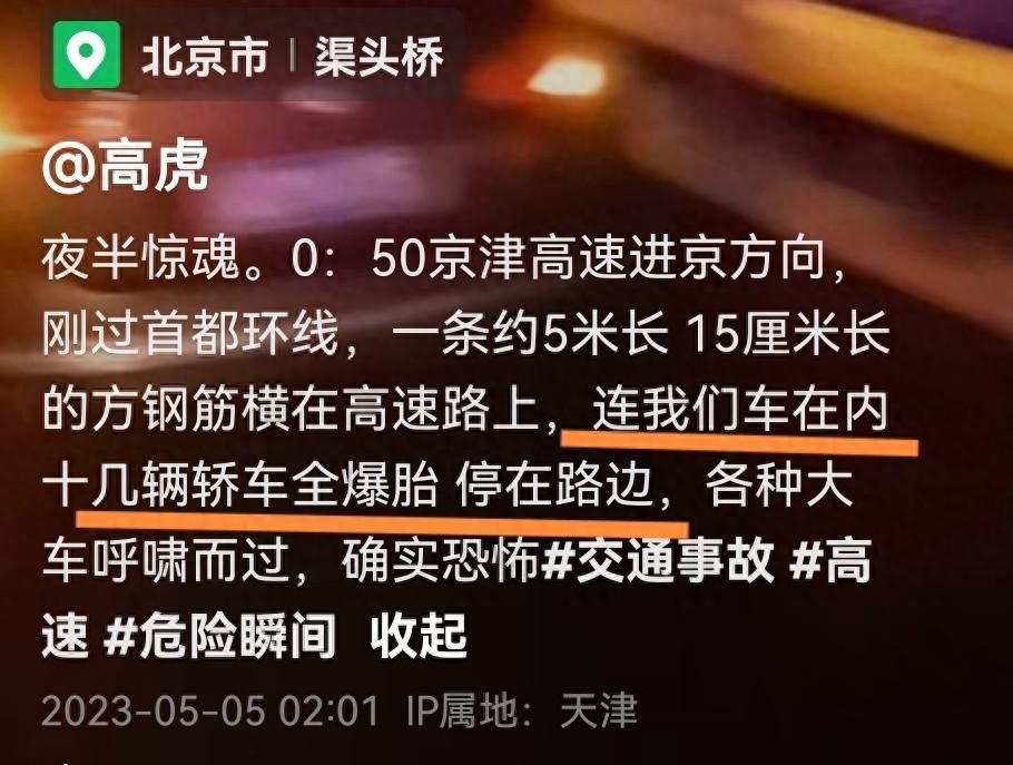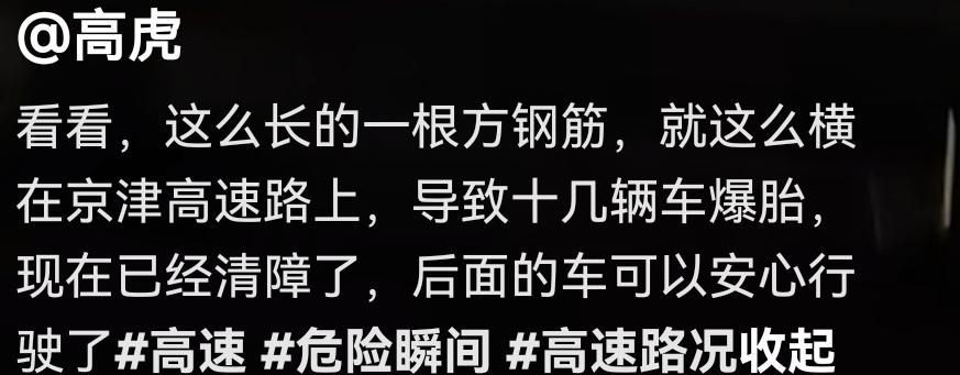 高虎还拍摄了一张钢筋照片,这么长的一根钢筋横在路上,别说是高速路,就是普通的道路也很危险。