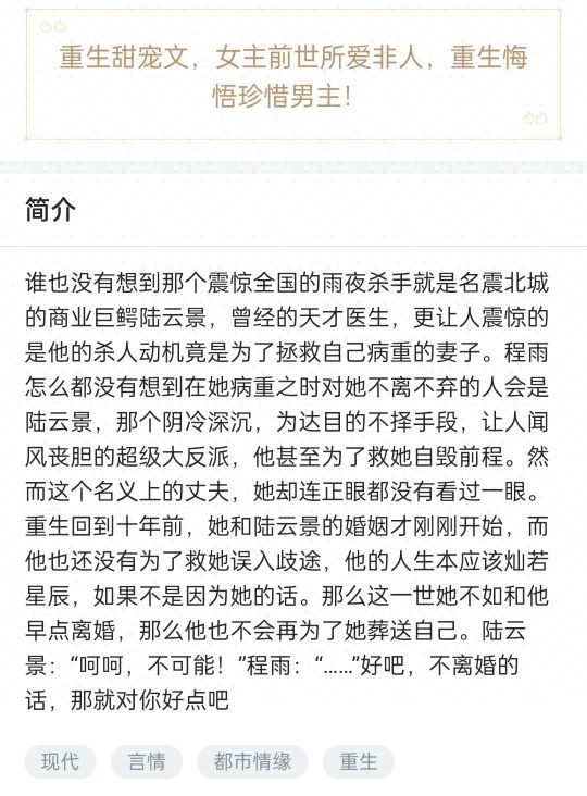 这个文不长,紫青悠的作品总是让人欲罢不能,非要一口气看完,陆云景为了程雨可以背叛全世界,程雨是他全部的信仰,从不会让人失望,这样的人只能在文章里遇见了。这里还有一个作者没明说,但是感觉程雨前男友陆承允应该是被男主设计的和简家小姐发生关系才抛弃女主订婚的,应该还是爱着女主的。另外还有一个女主的高中同学也是深爱着她的。大爱,强推,另外作者大大的其余几本也都好看,我看的第一个应该是《穿越之美满人生》,非常好,还有《暗恋成痴》也推荐。