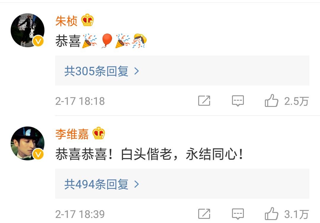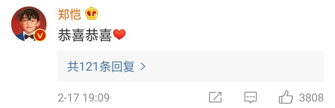 演员郑恺也在下方留言,恭喜恭喜他们两人。