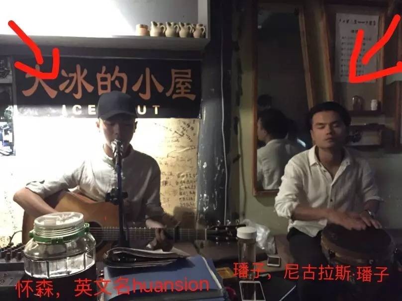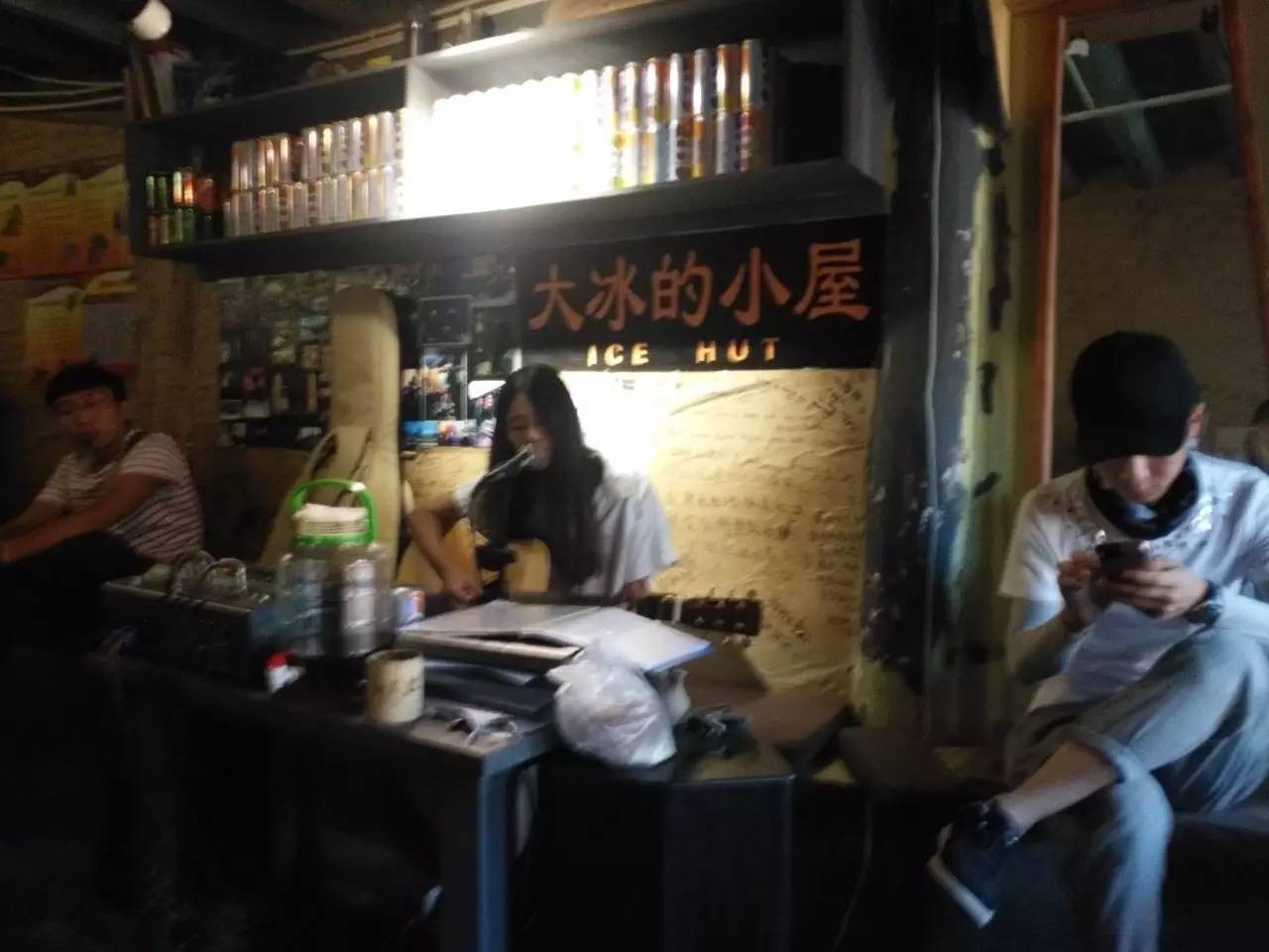 我和八戒晃了一天,吃完三爷的工作餐,看了会儿店,就告别了他们,去找了现实中的大冰的小屋。在人民路上,一个小小的铺面,一小块牌匾:大冰的小屋。下面破牌子写了,35元每人,可坐一天。进门找了个地儿随意坐下,问老板要了壶梅子酒和一瓶风花雪月啤酒。做在台上的是怀森,英文名叫huansion。怀森的长得是一个小男生的样子,歌里传达的感觉好像赵雷一般,当然赵雷也是大冰的小屋走出来的歌手,大冰以前书里还说,赵雷不红,天理难容。怀森在当晚的记忆中,好像唱了三首歌,然后强行在每首歌之间尬聊几句话。大概是希望把歌能串起来,表达下为什么要唱这首歌。顺便穿插下过往自己的情路之类的。