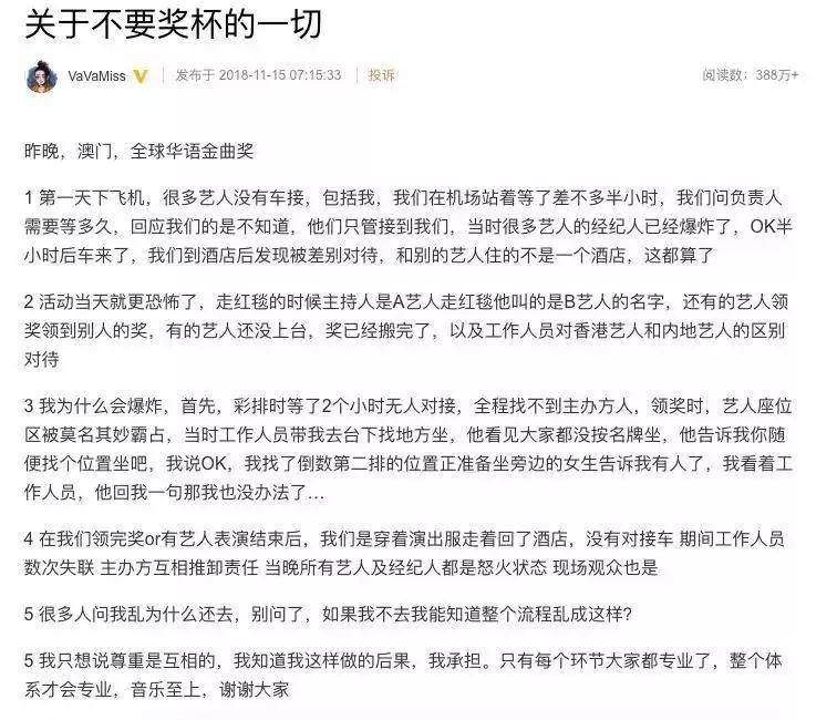 VaVa是好欺负的吗?如果是,当初就会乖乖地把奖杯捧走了。于是,她甩出了一篇《关于不要奖杯的一切》的长文,12345点罗列出自己这样做的原因:表示会为自己行为负责,懂得尊重但绝不委曲求全。