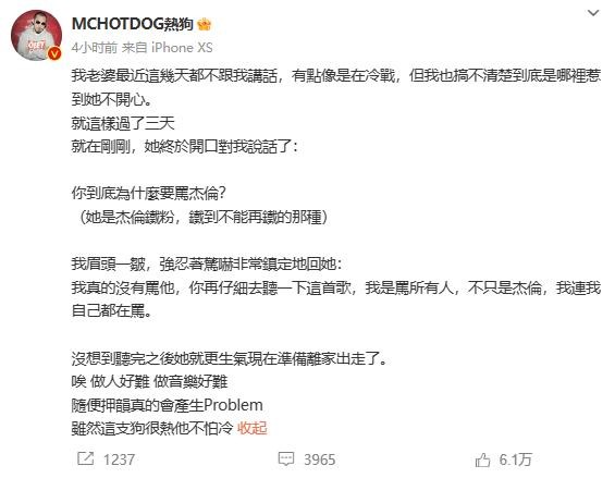 11月28日中午,热狗发文就此事作出回应。其称,“我是骂所有人,不只是杰伦,我连我自己都在骂。随便押韵真的会产生Problem(问题)。”