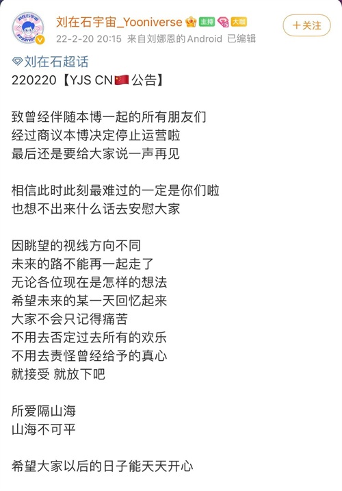 20日晚,刘在石个站宣布关站:“因眺望的视线方向不同 未来的路不能再一起走了”。粉丝大规模宣布脱粉,而造成这一切的原因可以说是刘在石本人咎由自取。