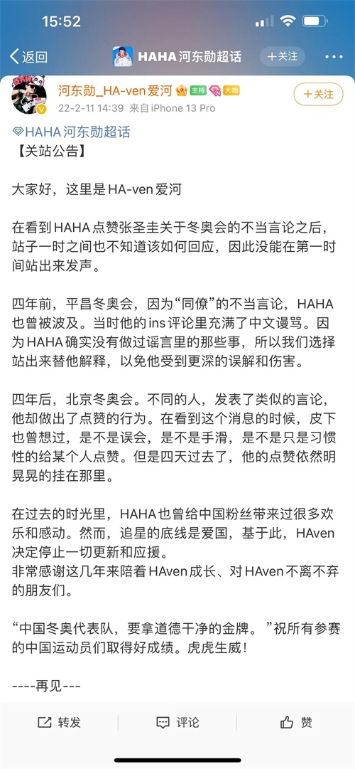 《Running Man》中翻车的韩国明星不止是刘在石,河东勋HAHA点赞了张圣圭关于这次北京冬奥会的错误言论,其个站也宣布关站。