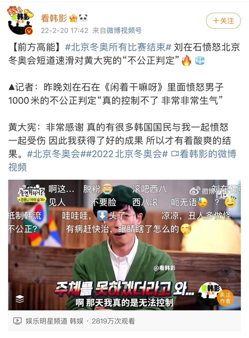 日前,刘在石在《闲着干嘛呀》综艺中,公开表达了男子速滑1000米的“不公正判定”的愤怒,认为对韩国选手黄大宪的判罚不公正。