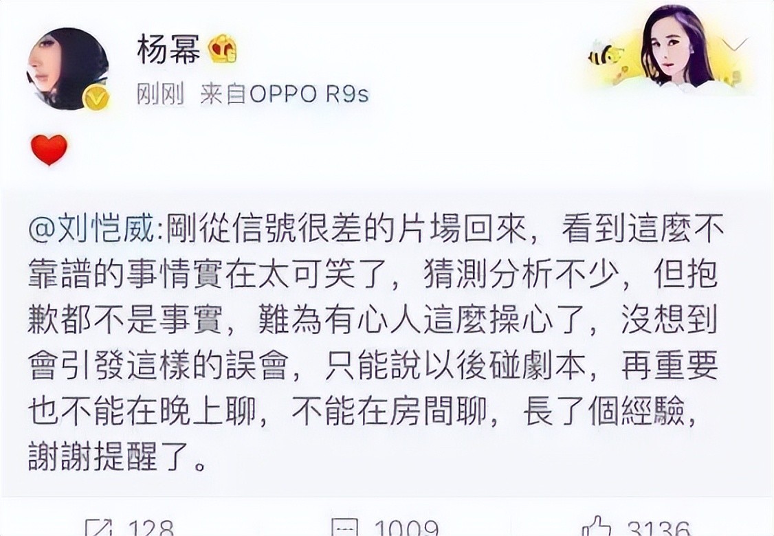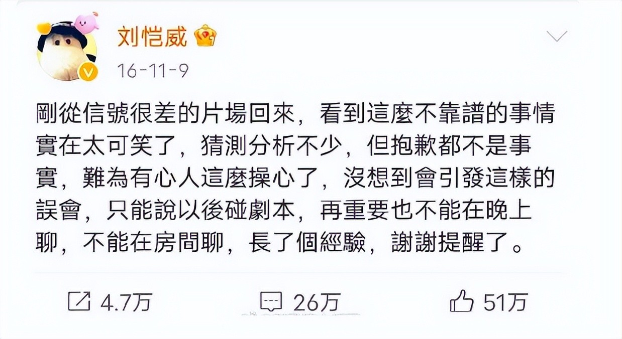 刘恺威否认出轨,表示 " 再也不能晚上在房间里聊剧本了 "