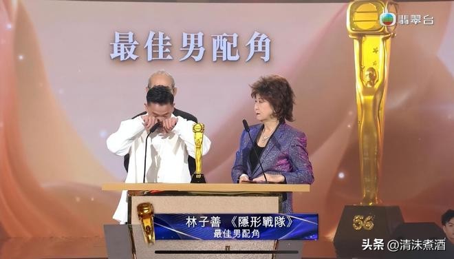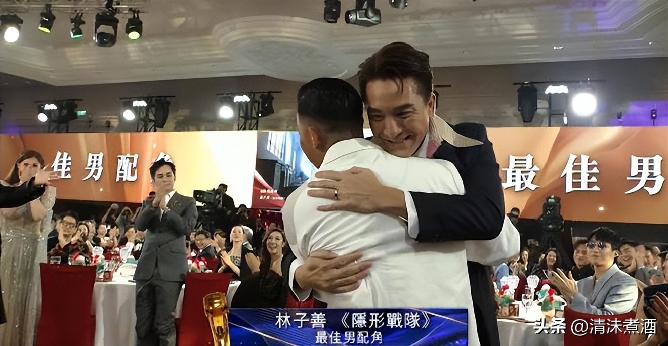 林子善的领奖风格与高海宁如出一辙。他既惊又喜,表达了难以置信的心情。随后,他与亲密的好友马国明深情拥抱,而在台下,众友人则捂着脸,泪流满面,为林子善的获奖感到由衷的高兴。