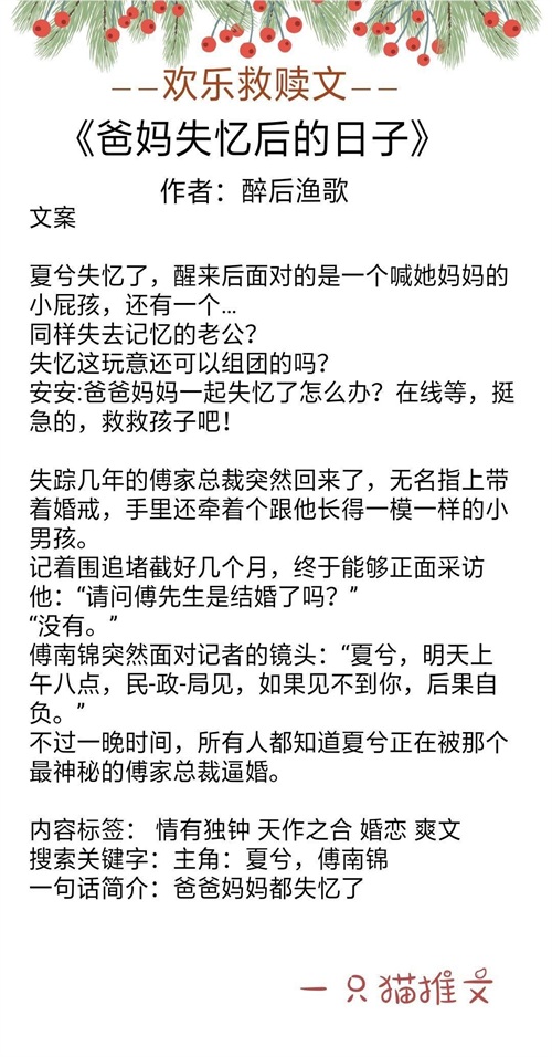 双双失忆梗,男女主出了车祸一起失忆了,梗虽然有点狗血,文笔也没有很成熟,但是还挺好看的。两人醒来都发现自己失忆了,还有了个儿子,他们两个的儿子特别可爱,是个小助攻,于是夫妻俩开始带娃培养感情。