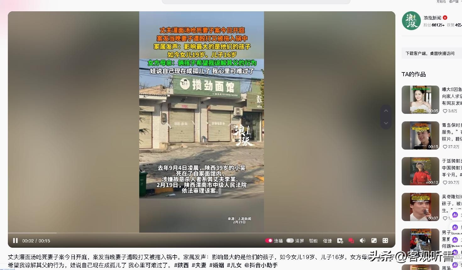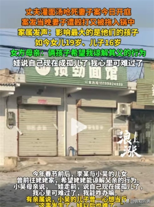 参考信源:抖音账号浪潮新闻2025-02-19《丈夫灌面汤呛死妻子案今日开庭,案发当晚妻子遭殴打又被拖入锅中。家属发声:影响最大的是他们的孩子,如今女儿19岁、儿子16岁。女方母亲:俩孩子希望我谅解其父的行为,娃说自己现在成孤儿了 我心里可难过了》