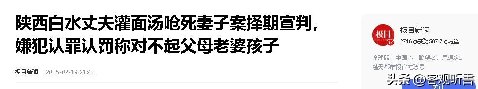 参考信源:极目新闻2025-02-19《陕西白水丈夫灌面汤呛死妻子案择期宣判,嫌犯认罪认罚称对不起父母老婆孩子》