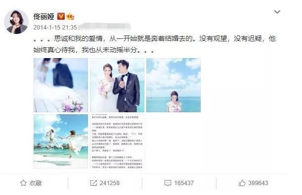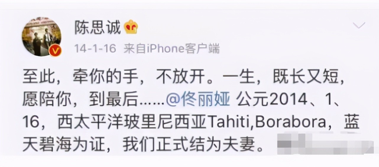 直到第二天,陈思诚才做出回复:“至此,牵你的手,不放开。一生,即长又短,愿陪你,到最后....@佟丽娅 公元2014、1、16,西太平洋玻里尼西亚Tahiti,Borabora,蓝天碧海为证,我们正式结为夫妻。”