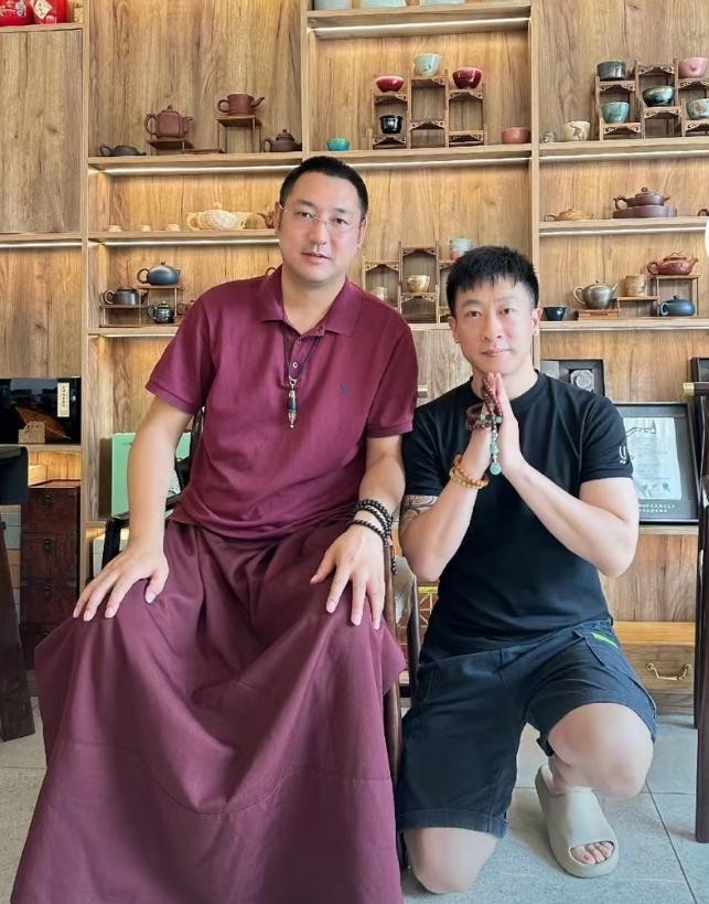 尽管照片极其简单,但其中却蕴含着一股无法忽视的震撼之力。画面中,张尧身着一件黑色的短袖,谦卑地半跪在一位庄严的佛教大师旁边。