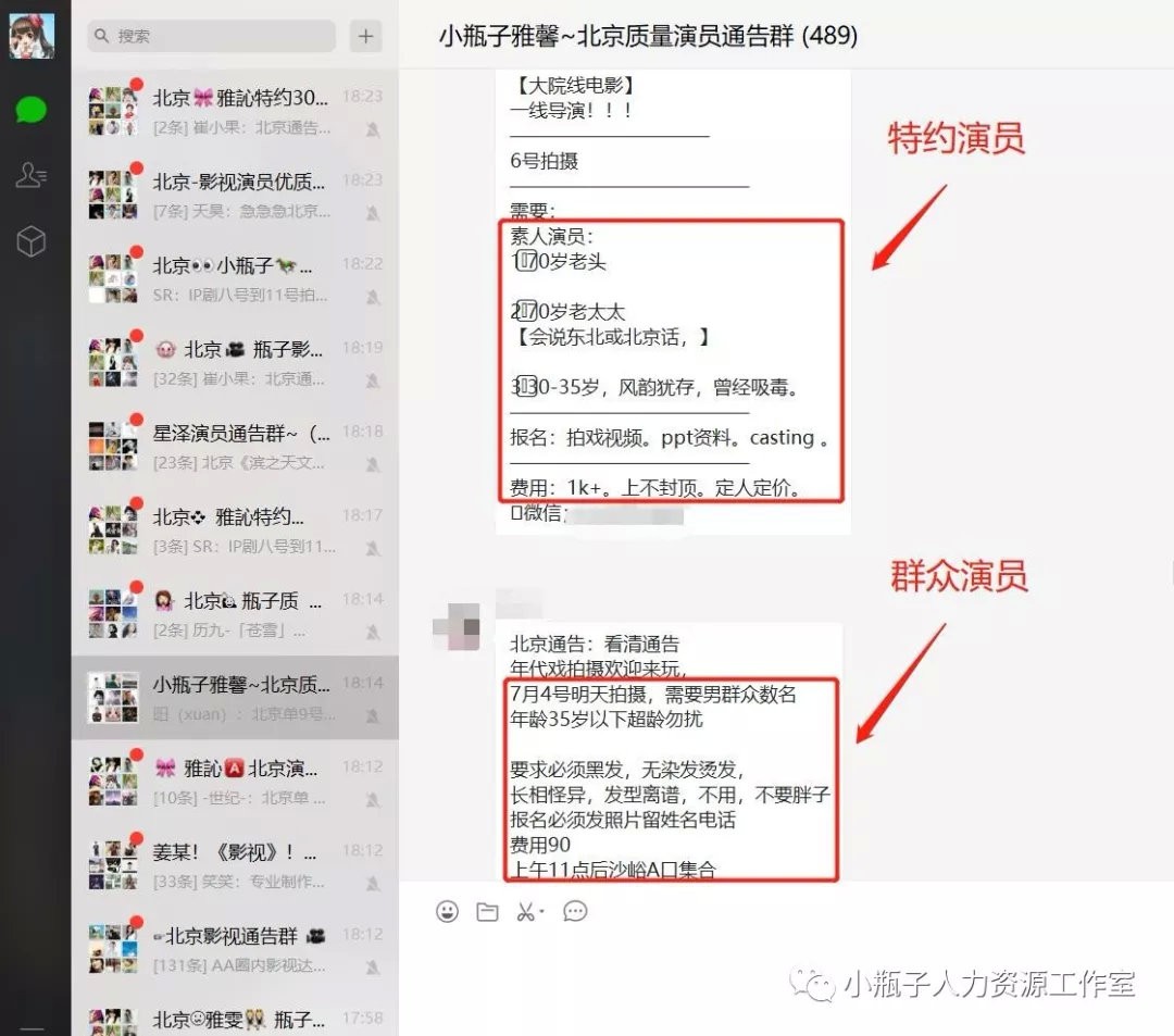 (2)、通过圈内演员群。北京跑演员现在最普遍的接戏方式就通过圈内的演员通告群来获取各类剧组拍摄用人通告信息,圈内演员通告群日常汇集圈内各类选角casting工作室群头,演员经纪和副导演的通告,演员日常可根据自身条件去找戏接戏通告。