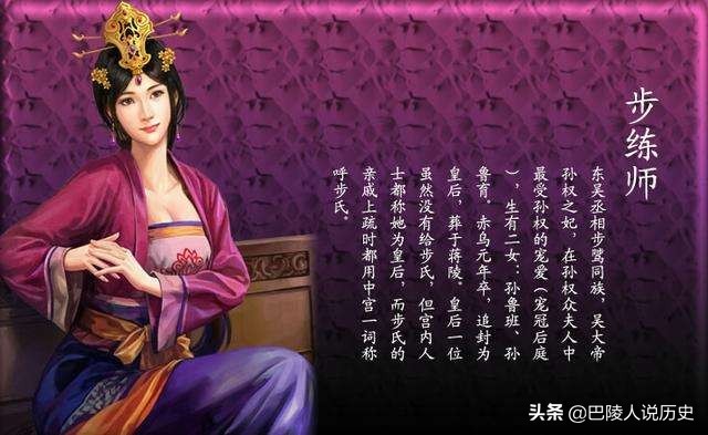 步练师,东吴大帝孙权之妃,东吴丞相步骘同族。据说是孙权众多夫人之中最漂亮的一个,步夫人是吴大帝孙权后宫中最为得宠的妃子。史书上说她“以美丽得幸於权,宠冠后庭”,“性不妒忌,多所推进,故久见爱待”。孙权即帝位,拜为夫人。宫中以皇后礼节待之。赤乌元年(238年),步练师去世,追封皇后,葬于蒋陵。这是皇帝追封妃妾为后的最初案例。