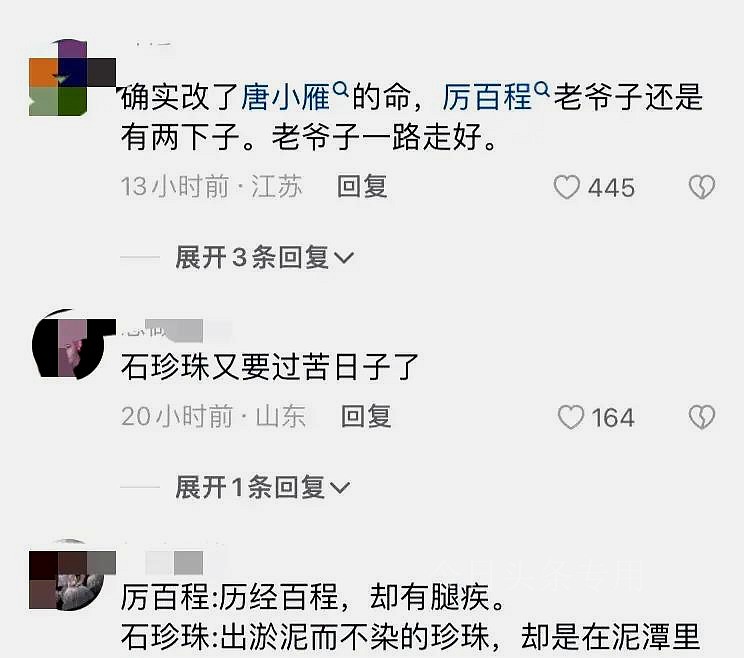 无论如何,我们仍然希望历百程一路走好。他的一生就像是一场漫长的旅程,经历了许多坎坷和挑战。我们也要感谢徐童导演,因为他让我们看到了那些在不同时空中坚韧不拔的小人物,以及其中的人际情感纷争。历百程和石珍珠的故事虽然平凡,但充满温情,深深感动了人们。愿未来有更少的离别,更多的幸福。