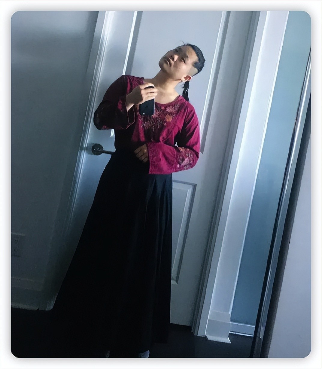 毕凌把双鬓全部剃掉,再把头发扎成了一个马尾,穿着黑色长裙,别有一番韵味。