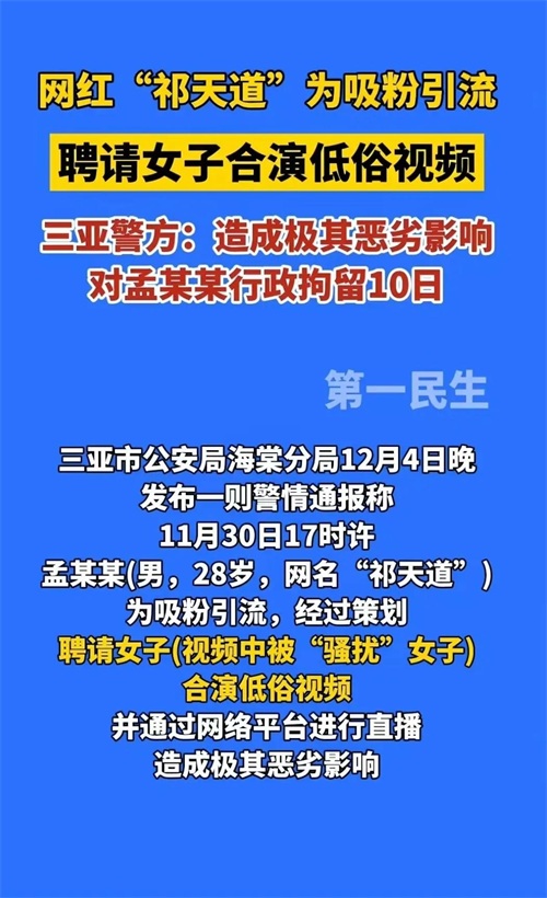 近日,祁天道在直播时,为了吸引流量,与团队策划聘请女子合演用竹签戳女生屁股,蹲看女生隐私部位、拍打女生屁股的低俗行为。