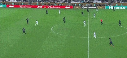 第83分钟,面对起势的法国队,恩佐带球越过中线,利用左侧2名队友的牵制,将球塞给前方的中锋阿尔瓦雷斯。这套配合的最终目的很明确——迅速把球给到梅西。