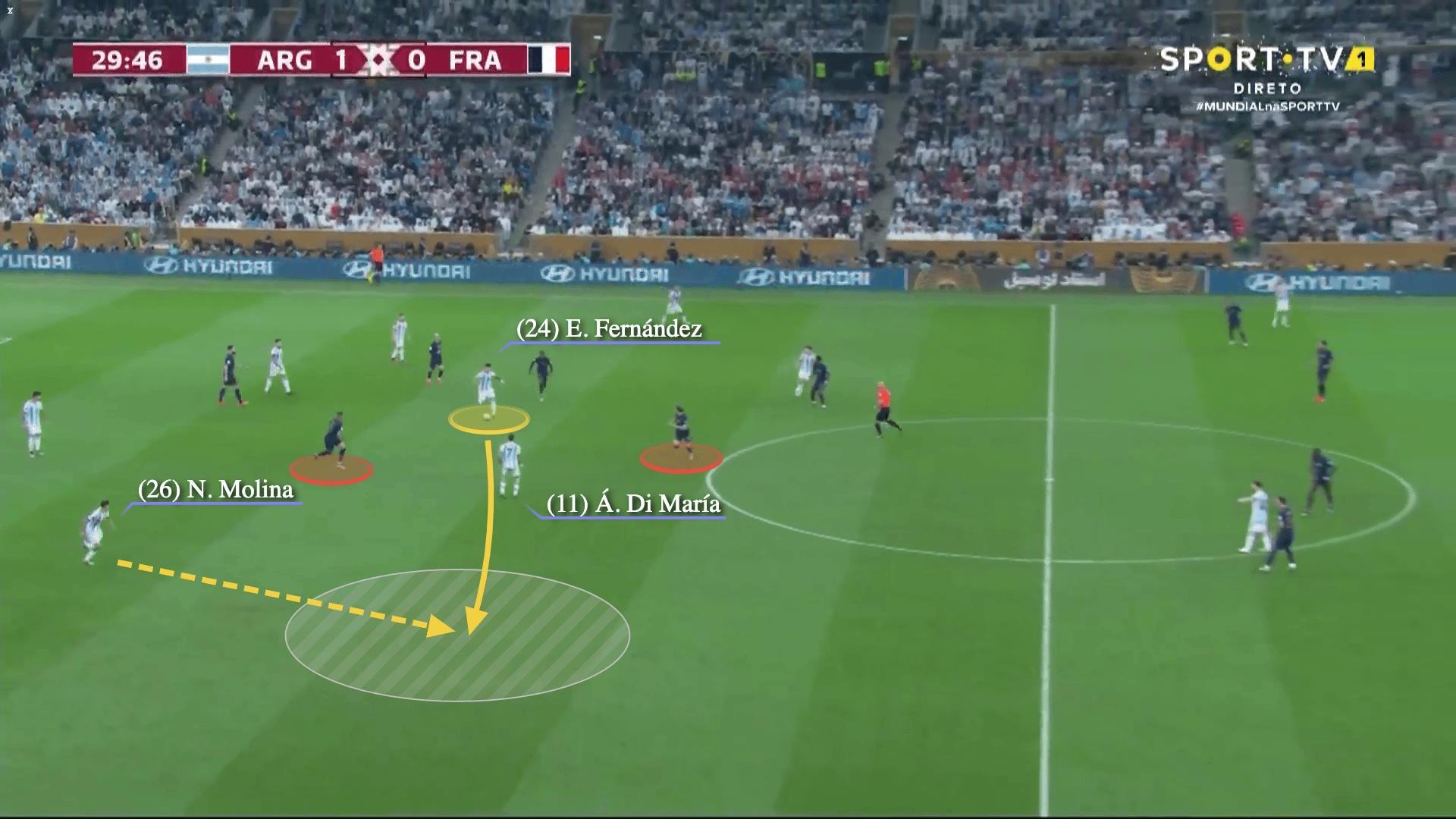 按照德尚的指示,法国队在高位给球的压力并不大,这也让恩佐获益。在下图这次攻防回合中,恩佐在本方半场拿球,法国队有6名球员来到前场,并未全力合围。恩佐敏锐地观察到:自己和迪马利亚之间一条传球线路,但此时若把球给过去,后者立马会被姆巴佩和拉比奥包夹。因此,恩佐选择将球传给后方插上的边卫莫利纳。