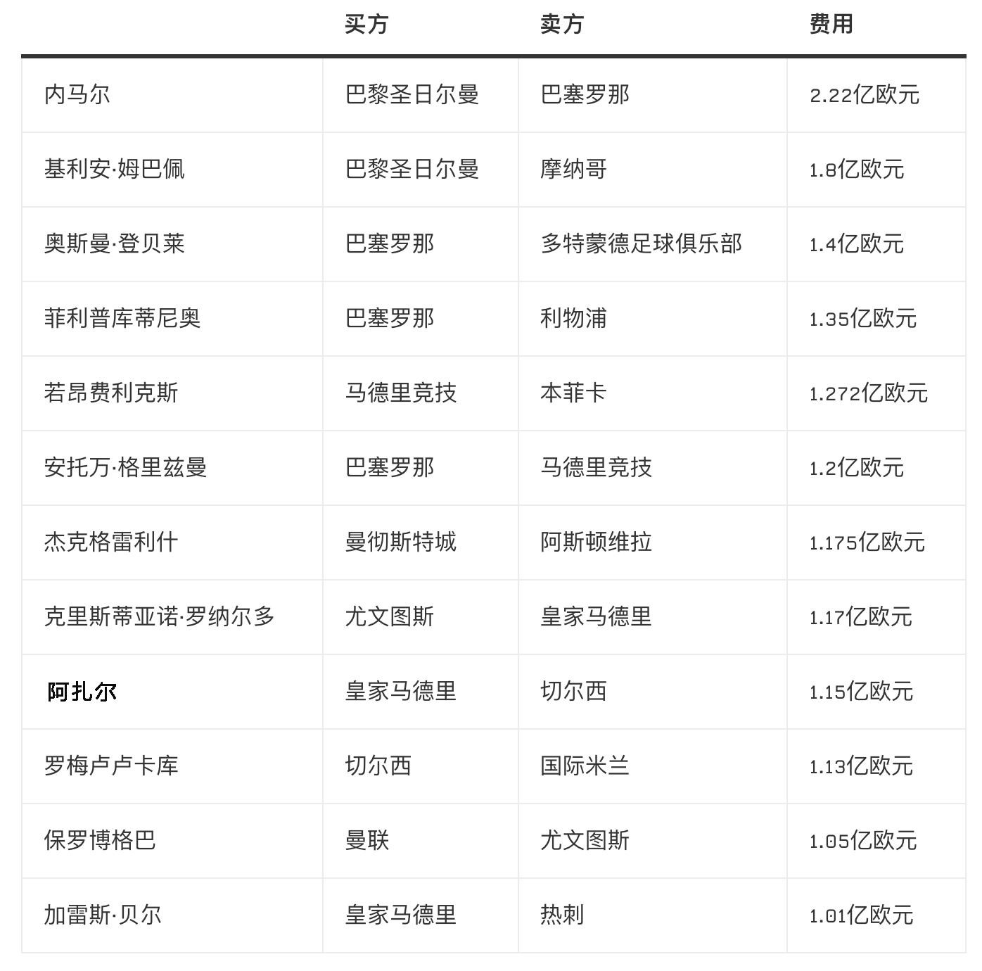 上表里的很多球员,到新东家后表现都不尽如人意,这一定程度上是因为转会费拉高了期待。足球比赛中,一支球队需要11名上场队员;平心而论,世上有几个球员的影响力能大到让其身价超过1亿欧元?