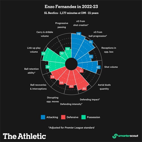 如下方的Smarterscout的饼图所示,恩佐是一名攻击性很强的中场组织者,也有非常不错的防守能力。