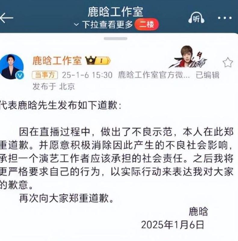 后来,鹿晗的账号于多个平台突遭禁关,鹿晗工作室也发布致歉声明,表示鹿晗日后会积极承担责任。