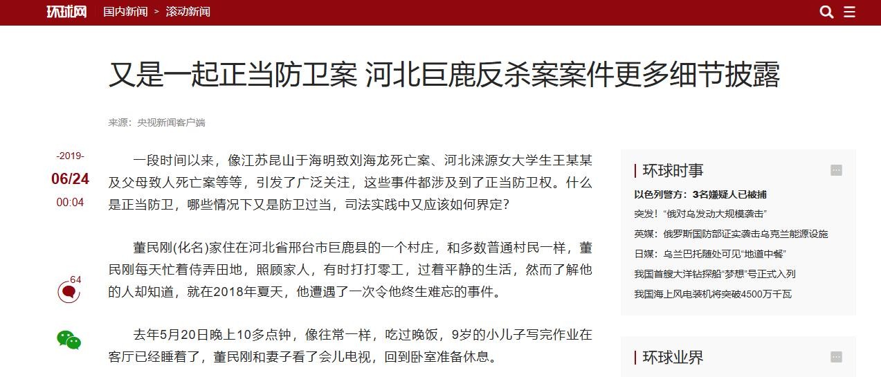 又是一起正当防卫案 河北巨鹿反杀案案件更多细节披露 环球网-央视新闻客户端 2019-06-24