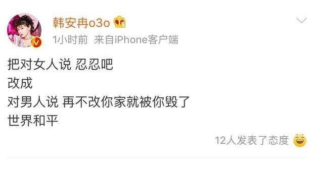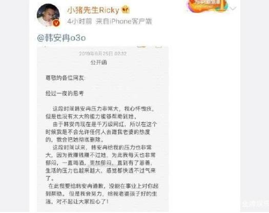 而老公小猪先生也在微博公开向老婆承认错误,表示自己没有韩安冉赚的多,韩安冉是一个千万级的网红,而自己赚的也少,所以经常一个人喝酒,而且也非常的郁闷,之后女儿出生压力就更大了。并表示自己会改。