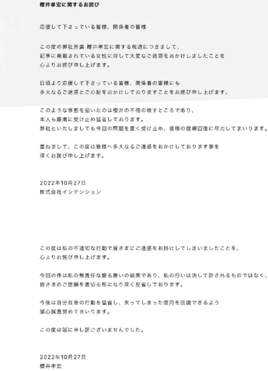 据日媒报道樱井孝宏婚内出轨时间长达10年之久,出轨期间连小三都不知道他已经有老婆并结婚了。前两天他主持的长达9年的广播节目突然宣布停播。猜测为出轨的问题,一时引起大众热议。据悉,樱井孝宏与支持该节目放送的女作家交往超过十年,但9月23日,文春拍到他与妻子的照片, 女作家才知道他已经结婚了。文春记者当面问樱井孝宏关于出轨的事实,他全都承认了。在今天樱井孝宏公开发文道歉: