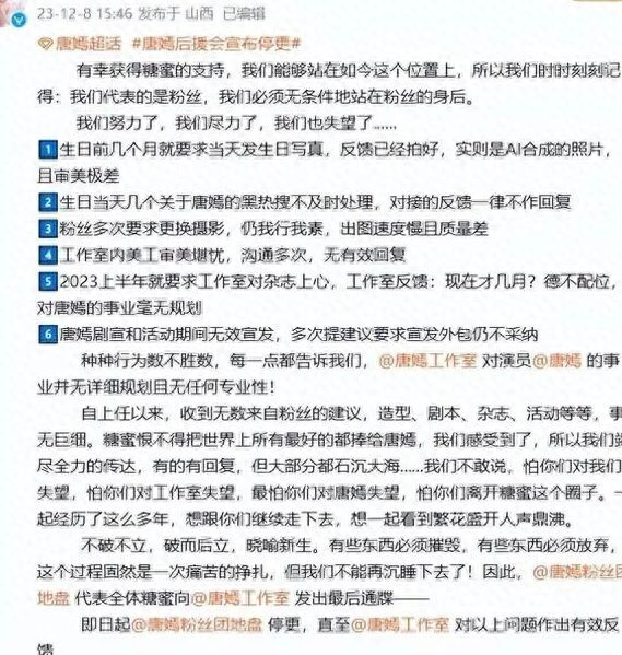 12月8日,唐嫣的官方粉丝后援会突然宣布停更,掀起一场关于唐嫣工作室的风波。后援会公开指责工作室在唐嫣事业规划、审美观、宣传等方面存在问题,并列举了六大疑问。这一事件引发了公众对明星工作室运作的关注,唐嫣方暂未回应,舆论亦褒贬不一。