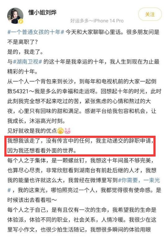 去年,刘烨也选择从湖南卫视辞职,称自己主动辞职,想去外面的世界看看。