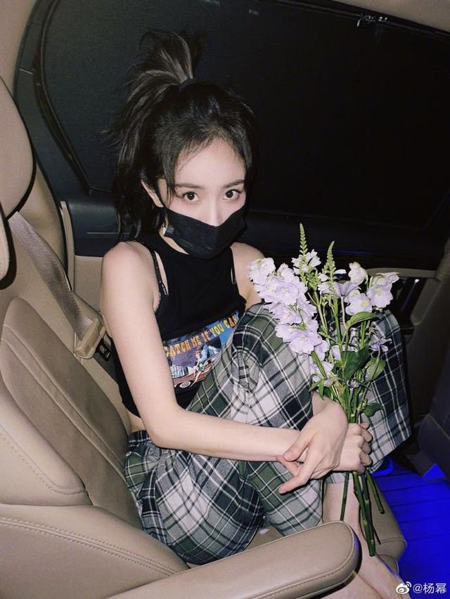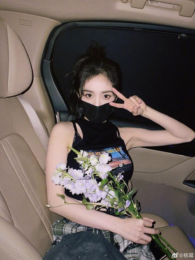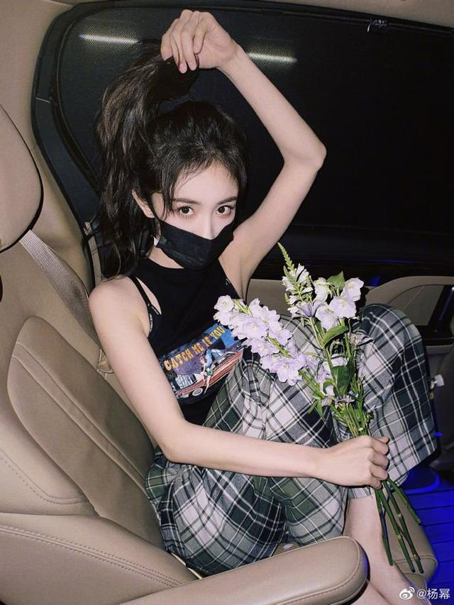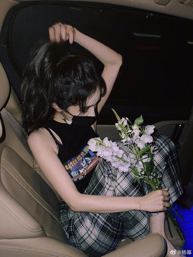 杨幂晒车内随拍九宫格 捧花束扎少女高马尾元气满满