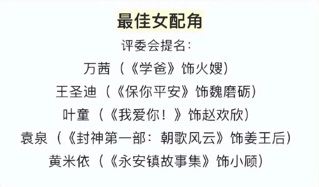 万茜凭借《学爸》里的火嫂被提名,叶童凭借《我爱你!》入围,还有《封神》的袁泉等人。