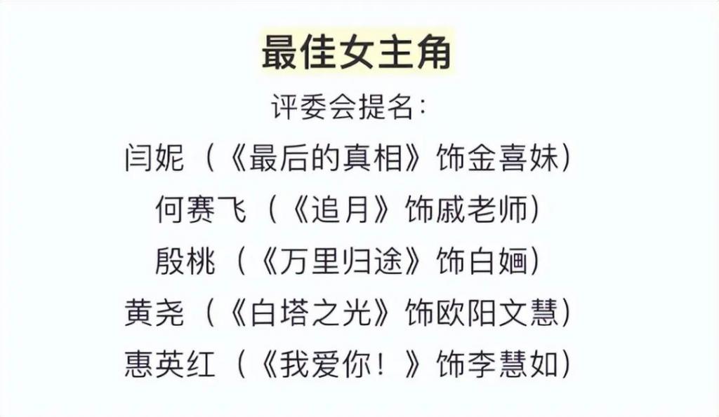 《最后的真相》里的闫妮、《追月》里的何赛飞,《万里归途》戏份不多的殷桃,还有《我爱你》惠英红以及《白塔之光》黄尧五位女演员进入了决赛圈。