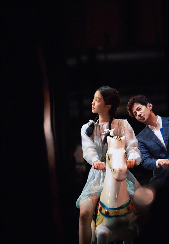 舞台上,有一个穿着碎花裙子,头上绑着两个可爱的蝴蝶结的“小女孩”。
