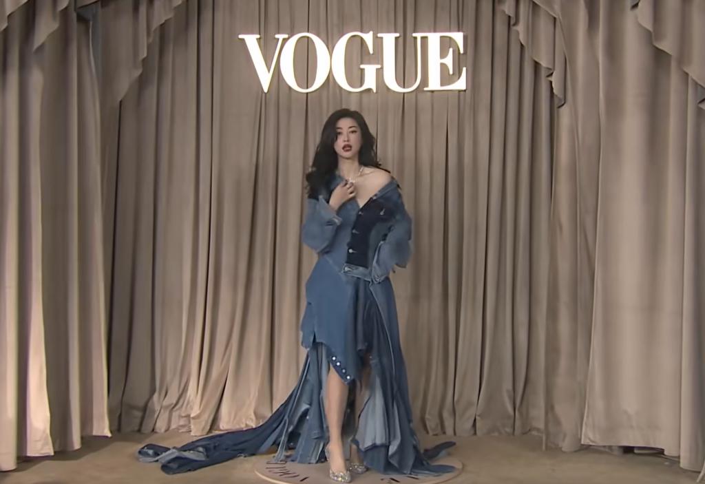 朱珠这条牛仔长裙据说是 " 废土风 ",看起来像是设计师用了好几件牛仔外套拼接而成的礼服。八先生觉得如果换个容貌较为普通的人来穿,应该会被吐槽是 " 破烂风 "。