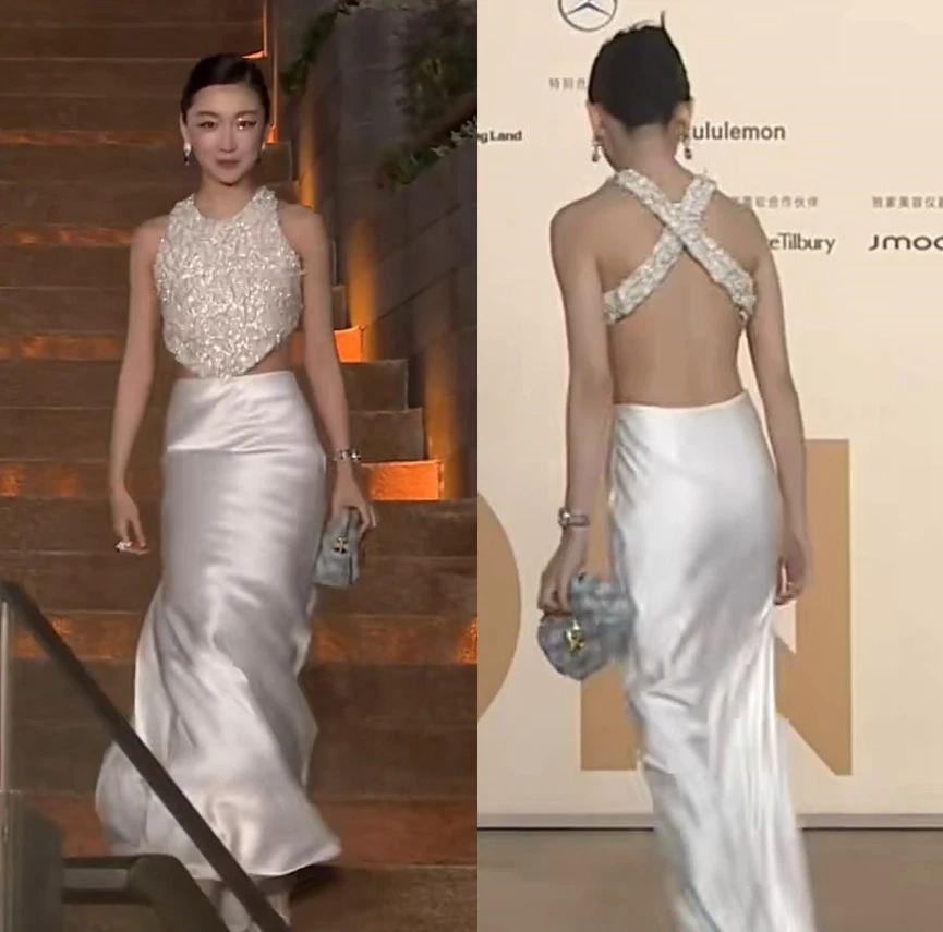 另一位谋女郎周冬雨,穿的是两截式礼服,亮点在于上衣的大露背设计。