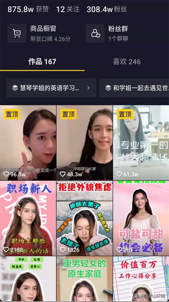 再说高粉丝。她的账号“同学请坐”在抖音拥有300多万粉丝的网红,全网有800多万 粉丝。以她自身的学习考试经历说教育,自然更接地气,更为年轻人所接受,因此经常以学姐的身份教大家学习的方法受到欢迎。现在的平台这么多,要涨粉可不容易,可是慧琴有那么多粉丝。