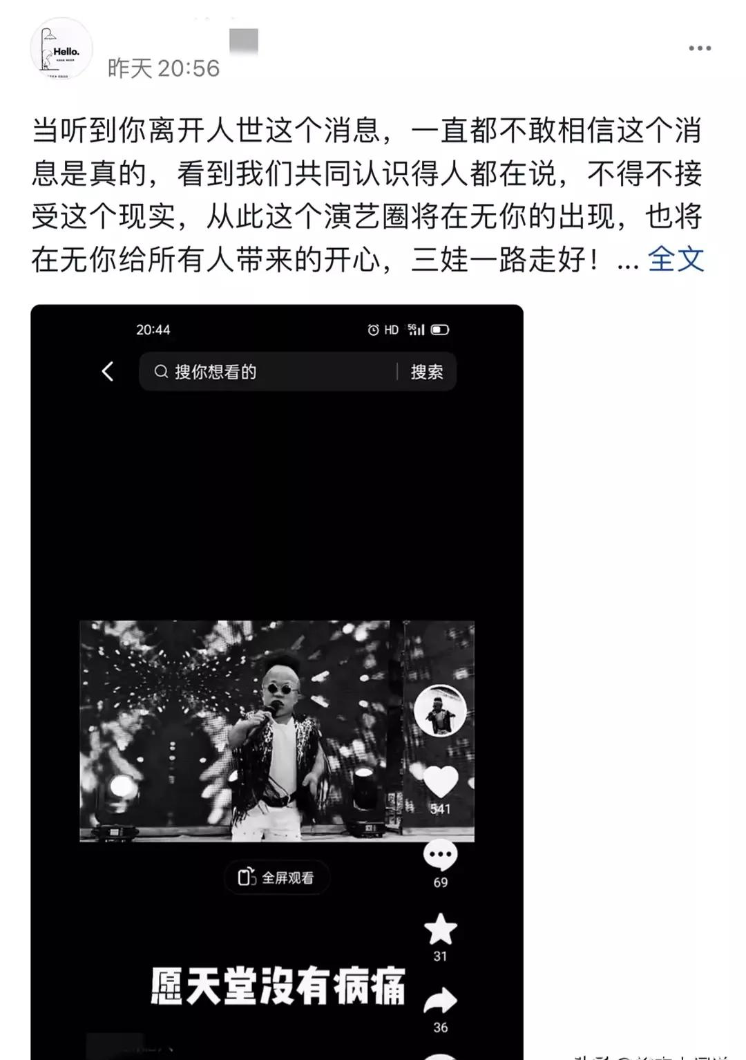 三娃子的朋友说:当听到你离开人世间的消息,一直都不相信这个消息是真的,看到我们共同认识的人都在说,不得不接受这个现实,从此这个演艺圈将在无你的出现,也将无你给所有人带来开心,三娃一样走好!