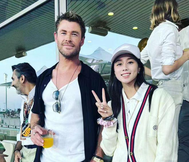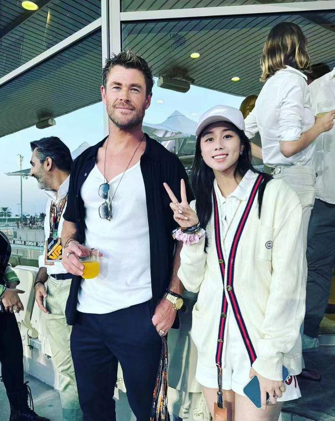 在赛车场里还有一位好莱坞明星,那就是曾经出演漫威电影系列的《雷神》的主演锤哥 Chris Hemsworth。Chris 穿着白色打底衫搭配黑色开衫外套与黑色长裤,手里拿着一杯果汁,胸前还挂着一副太阳眼镜,看起来十分休闲。何超欣站在他身边,伸手比耶拍照,笑得很开心,看样子是粉丝追星成功了。