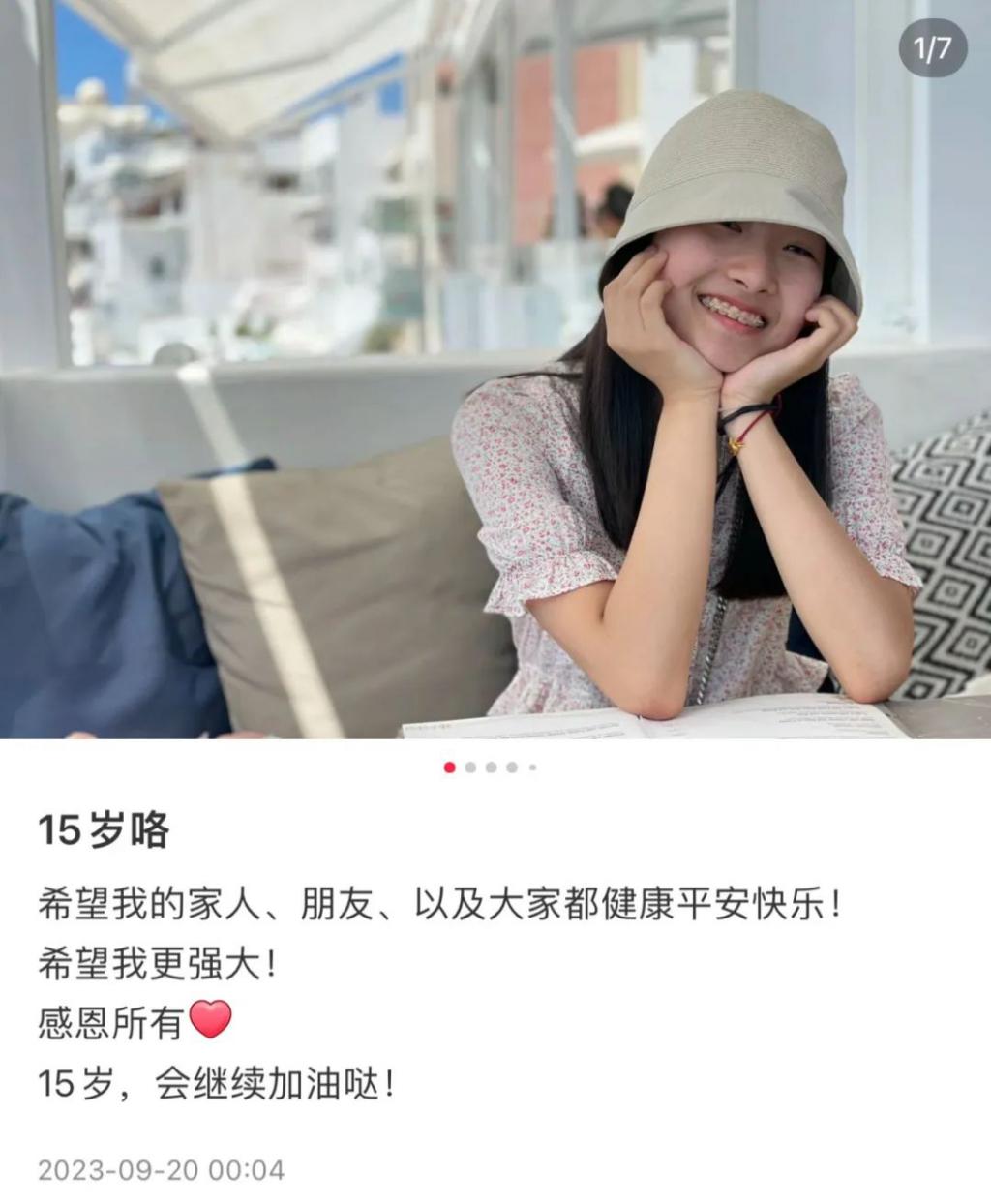 15 岁生日,她发了自己和妈妈、爸爸、妹妹的合照。