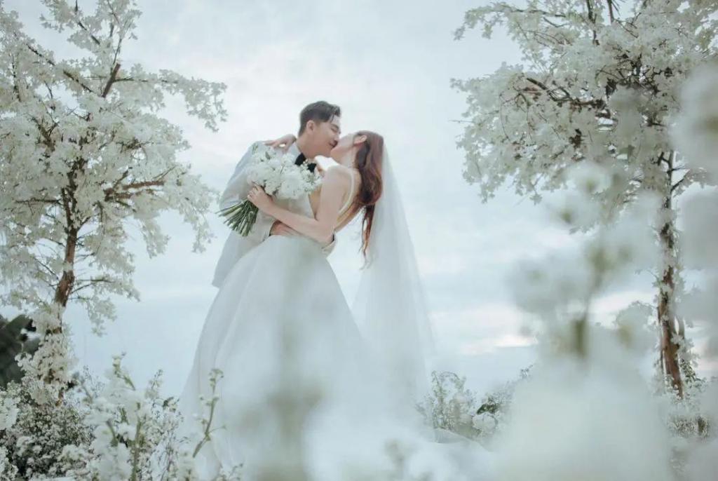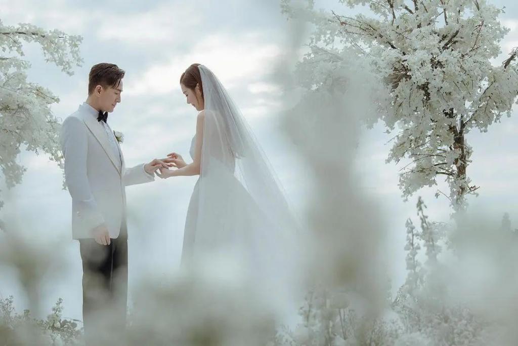二人的婚纱照庄严洁白,在一片白色花海下举行,汤洛雯一袭性感婚纱,仙气飘飘。