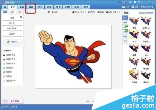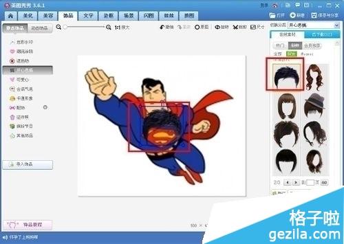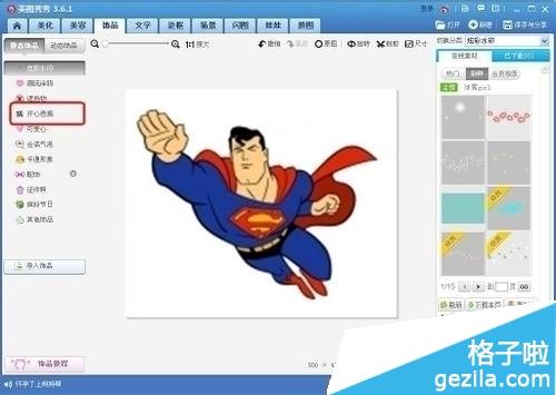 2:在美图中选中饰品选项,在饰品选项里面选定开心恶搞。(这里是用超人做的示范希望超人不会在意这点小细节)