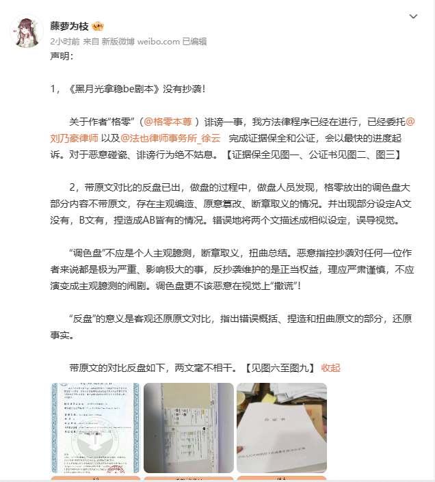 藤萝为枝:《黑月光拿稳be剧本》没有抄袭,以最快进度起诉“格零”诽谤